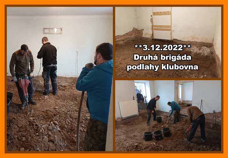 Na další termín 3.12.2022 se nás sešlo už jen 5 a to je 1/4. Práce stále dooosti náročná. Bez sbíječky bychom se asi nikam nepohnuli. Myslím, že ta zadní místnost šla o poznání hůře. Nakonec jsem v odpoledních hodinách dodělali a může nastoupit firma. Všem zúčastněným moc děkuji.**VH