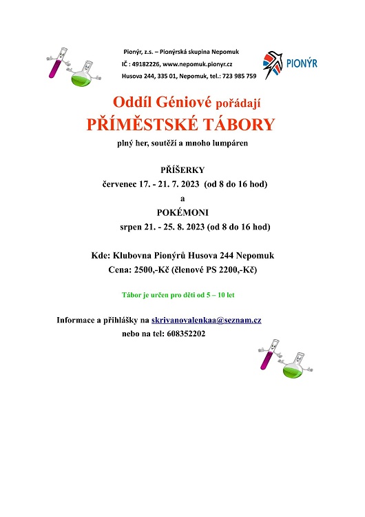 Nabídka na lerní dětské tábory pořádané Pionýrskou skupinou Nepomuk. O přihlášky kontaktujte přímo vedoucího táborového běhu viz letáček.