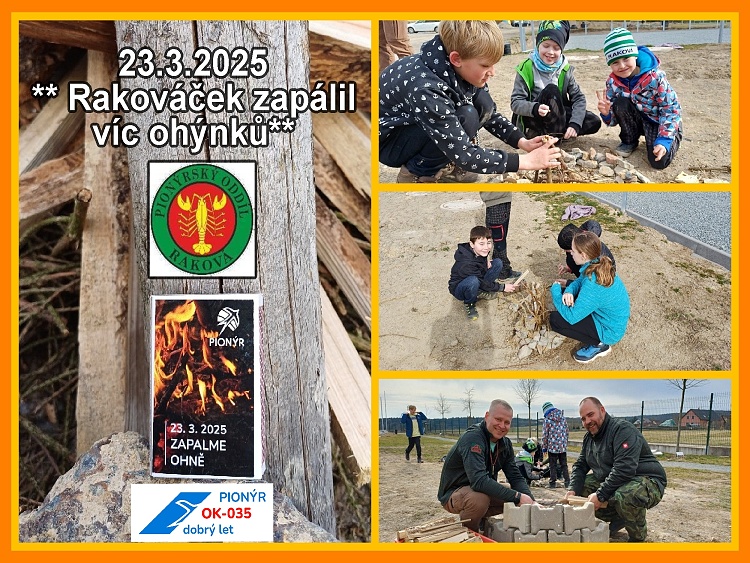 I náš oddíl Rakováček se zapojil do pionýrské akce, v rámci které proběhl pokus o rekord. My jsem akci spojili i s přespáním v naší klubovně. Několik dní před plánovanou akcí jsme si s dětmi při oddílové schůzce připravili materiál k podpálení ohně. Vyrazili jsme do blízkého lesa, abychom nasbírali klestí, smolu a březovou kůru. V sobotu 22.3. jsme se s dětmi sešli v klubovně. Po přípravě ohniště nám zbývalo do zapálení ještě mnoho času, a tak jsme si zahráli dětmi oblíbený eskymácký basball. Pak už byl čas, kdy se měly rozhořet ohně na různých místech republiky, včetně toho našeho. Takže v 16,30 zapáleno, opekly jsme si buřty, chvíli poseděli a poté jsme oheň i ohniště opět pečlivě uklidili, abychom mohli pokračovat v dalším programu. Instruktorky měly pro děti nachystané další hry, například hutu, štafetové zatloukání hřebíků, v klubovně pak židličkovanou. K večeři jsme si pochutnali na výborných hamburgrech. A jelikož mezitím už padla tma, tak ještě před ulehnutím do spacáků nás čekala stezka odvahy, která vedla okolo nedalekého hřbitova. Po návratu do klubovny už se všichni převlékly do pyžam, zalezli do spacáků a užili si promítání pohádky. Druhý den ráno jsme vyrazili ven na rozcvičku, po snídani jsme si pobalili věci, uklidili klubovnu a rodiče si vyzvedli své ratolesti. Akce se moc povedla, bylo to první přespání v nové klubovně a budeme se těšit, že takových akcí zažijeme ještě mnoho.**MarkétaV
