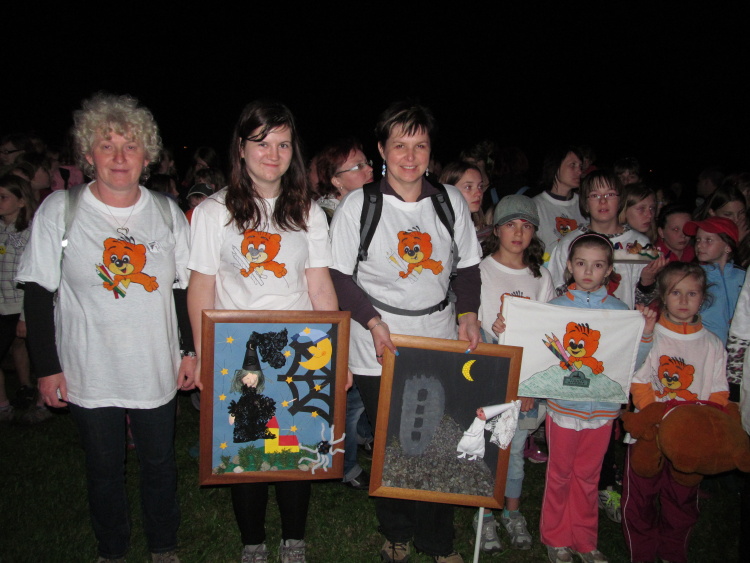 V pátek  před půlnocí se nám zjevila Bílá paní Apolena a předali jsme ji dary, které jsme přivezli z pod Zelené Hory. Byl to obraz Apoleny z Rýznberku a naší Zelenohorské Černé Dominiky. Přidali jsme také hradní myšky a kytici pro Apolenu.  V sobotu jsme plnili stanoviště a získávali indicie, které připravili organizátoři s Plzeňské krajské organizace Pionýra. Na zajištění se podíleli i naši vedoucí Vašek (plackovačka měla úspěch), Alena, Monika a Jana naučili děti udělat kapsičku z plstě na mobil. Naše parta děti pod vedením Míry prošla celé výtvarné městečko a tvořila  kouzelná razítka a medailonek, kytičku z orgeny, příšerku z ponožky, namalovaly si také parádní trička. U Vaška na plackovačce si udělaly Pusíkovské „placky“. K obědu byl vynikající gulášek a odpoledne jsme se zapojili do sportovních aktivit. Slíbili jsme také, že se vypravíme podívat do městečka Kdyně a zajdeme do tamního bazénu. Sliby se mají plnit a tak  odpoledne po třetí  jsme už plavali v novém bazénu a moc nám tam líbilo. Zpět jsme dorazili akorát na večeři.  Po krátkém odpočinku a výrobě speciálních lampiónků nás čekala další výprava a o to na hrad Rýznberk. Cesta tam byla lesem a místy dost rozbahněná. Kopec to byl  pořádný. Na hradě nás čekala cílová prémie od vedoucí Áji. Nanuk byl výborný. Vyšplhali jsme také hradní věž a rozhlédli jsem se do již stmívajícího se kraje. V hradním divadle už byla úplná tma a zde jsme splnili poslední úkol setkání a to vysvobodit Bílou paní Apolenu z jejího prokletí. Odpověděli jsme správně na sedm otázek a kletba dlouhá několik staletí byla zrušena. Odměnou nám byl nádherný medailonek  ve formě jablíčka. Cesta zpátky za svitu našich lampionů vedla přes Kdyni do našeho tábora Hájovna. Dorazili jsme kolem půlnoci a domnívali jsme se, že v neděli si trochu pospíme. Apolena nás však zvukem zvonů vzbudila už v sedm. Po snídaní byl slavností nástup a ukončení setkání. Děkujeme organizátorům setkání  za hezký víkend soutěží a dílen pod Rýznberkem. Potívejte se na fotografie ze setkání a prezentaci.