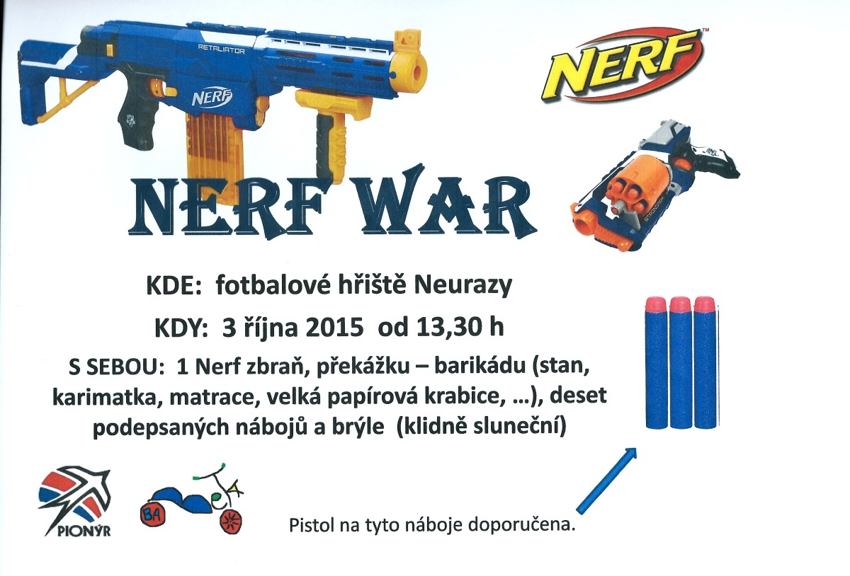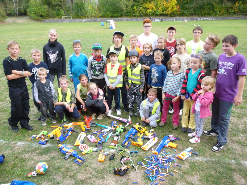 V sobotu 3.10. 2015 na našem hřišti vypukla obrovská nerf bitva, kterou připravil pionýrský oddíl Babety. Sešlo se přes 30 dětí a spousta rodičů, kteří pomohli postavit překážky, aby se bylo kde schovat. Někteří dospěláci i měli chuť si zahrát, ale děti nás nepustily ke hře. Opravdu si to užily a pro velký úspěch budeme bitvu opakovat. 3 týmy bojovaly každý s každým 2x a úkolem bylo sebrat vlajku soupeře. Při zásahu bylo nutné doběhnout k vlajce červeného kříže a pak zpět do hry. Velkou bojovnost projevily i děvčata a opravdu patřily k výrazným hráčúm. Vše proběhlo v pohodě jen pár postrácených nábojů. Po ukončení bitvy byla otevřena pionýrská střelnice - střelba ze vzduchovky na sladkosti.*M.Svejkovská