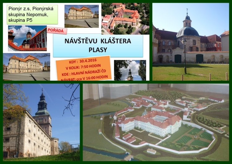 V sobotu 30.4.2016 uspořádala pionýrská skupina P5 návštěvu Kláštera Plasy. Akce se zúčastnili dva dospěláci. V sobotu jsme se sešli v 7:50 hodin na Hlavním nádraží ČD. Odtud jsme vyrazili v 8:16 hodin vlakem do Plas. Krátce po deváté hodině jsme vystoupili v Plasích na nádraží a vydali se do města na prohlídku. Od 10:00 hodin nám začala prohlídka Kláštera. Zde jsme se dozvěděli, jak se žilo mnichům a prohlédli si, jak byl klášter postaven. Klášter je postaven na dubových pilířích, které musí být pod vodou. Zajímavé je i vytápění a odvětrávání kláštera. Naše prohlídka končila v 11:00 hodin v jídelně kláštera.Do Plzně jsme se vrátili kolem 16:00 hodině.*M.Hejlík