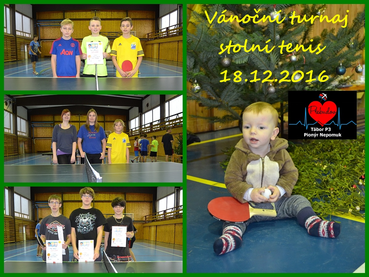 18. 12. 2016 se v nepomucké sportovní hale uskutečnil pionýrský turnaj ve stolním tenise, kterého se zúčastnilo kolem 60 osob, načež 46 bylo hrajících. Tito hráči se rozdělili do celkových 5 kategorií. Vítěz každé ze skupin si mohl domů odnést speciální odměnu, a sice živého kapra. Nicméně ani další místa nezůstala na suchu - druzí a třetí si mohli odnést diplom a cenu dle výběru, na ostatní čekala alespoň nějaká drobnost - svazek jmelí, psací potřeby a nebo třeba kalendář. Během necelých 8 hodin se stihlo odehrát 182 zápasů, které se vždy hrály na 2 vítězné sety a přinesly velice zajímavé výsledky, které jsou následující(rozklikni nadpis) *JB