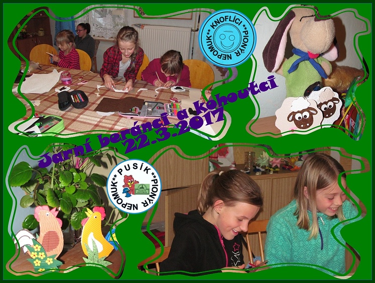 Letos jsou Velikonoce až v dubnu, ale naše oddíly Pusík a Knoflíci tvoří již jarně. Připravují velikonoční louku na naší výstavku. Vytvořili jsme kraslice XXL, beránky, kohoutky a zajíčky. Maminkám jsme také udělali pěkný zápich k MDŽ s kytičkou. Podívejte se na naše stránky oddílu Pusík.