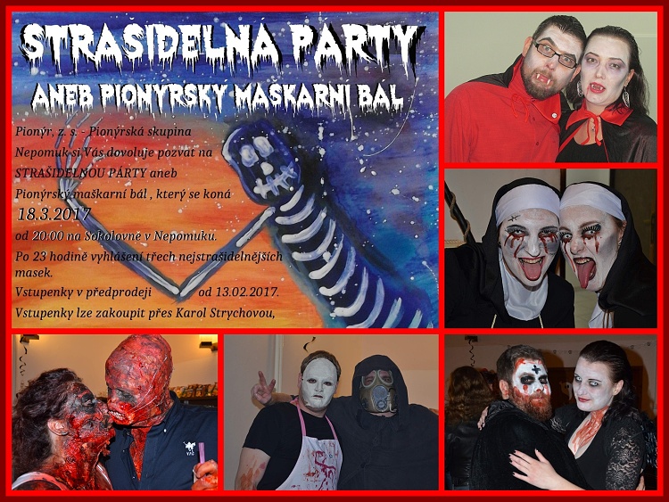 Pionýrský maškarní ples pro dospělé se konal 18. 3. 2017 ve večerních hodinách v nepomucké Sokolovně. Tématem pro tento ročník byla strašidla. Sešlo se zde kolem 100 lidí, jejichž masky byly skutečně pestré; byly zde woodoo panenky, zombie či známí filmoví zábijáci, ale nechyběli samozřejmě i staří dobří duchové či smrtky. Vyhlášení nejlepší masky ale nakonec dostala Šárka Šatrová se svým přítelem, kteří byli v obleku skutečně autentických zombie. K poslechu a tanci nám zahrála (možná už tradičně) hudební skupina Orion. V jejich přestávkách se konaly samozřejmě nějaké disciplíny, které měly skutečně velmi vtipný podtext a trvaly kolem deseti minut. Během krátké půlnoční pauzy kapely se konal los tomboly, do které přispěla celá řada sponzorů a my bychom jim tímto velice rádi poděkovali. Velké dík také samozřejmě patří kapele Orion, organizátorům akce, nepomuckému pionýru, ale nejvíce samozřejmě všem, co přišli. *Jarda Brejcha