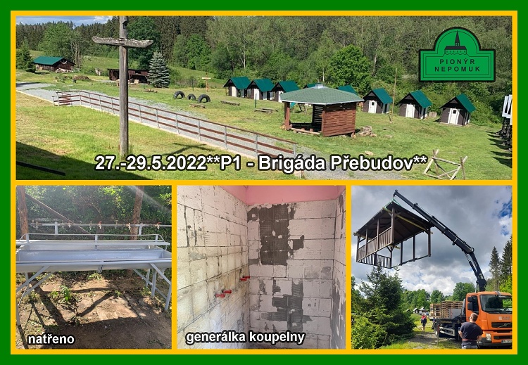 Jak už tak bývá zvykem, poslední víkend v květnu (27.-29.5.2022) patří na Přebudově brigádě P1. Sešli jsme se v pátek v podvečerních hodinách a rozplánovali následující pracovní den. Ráno jsme vstali natěšeni na práci. Tři křovinořezy, auto s hydraulickou rukou, barvy, štětce, bourací kladiva…. Možná to zní podivně, ale opravdu, tyto nástroje jsme využili. Trávy zde bylo obrovské množství a sekání zabralo skupině sekáčů a hrabačů celý den. Posekali jsme téměř vše. Zbývá jen stráň, která je na legendárního „trojzubce“. Proběhlo stěhování pergoly, kterou jsme dostali darem v Kladrubcích. Zde nám pomohlo zmíněné auto s HR a stěhování byl celkem adrenalin. Úzký průjezd mezi domy v Přebudově byl, jak se říká, o fous. Obnovovací nátěr na korytech, kde si čistíme zuby, proběhl již poněkolikáté. Zde by stálo zauvažovat o výměně za nerez i za cenu, že koryta budeme na zimu uklízet. Bourací práce navazovaly na naši dubnovou brigádu a i pravá koupelna je zbavena obkladu a připravena na rekonstrukci. Večer probíhaly přípravy na tábor samotný, který je skoro za dveřmi a sledování sportovních událostí.**P1 team*JV.