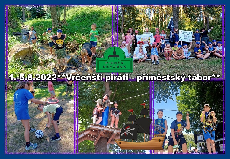 První srpnový týden přivítal Jack Sparrow na palubě Černé perly svou posádku na příměstském táboře ve Vrčeni, která čítala 18 pirátů a 3 kormidelníky. Vypravili jsme se shromáždit poklad, abychom zlomili kletbu posádky. Trénovali střelbu kvůli případnému napadení, hledali klíč k truhle mrtvého muže, učili se lézt po lanech na výletě v Sušici. Navštívili nás kamarádi s pejsky a ukázali nám, jak probíhá jejich výcvik. Nakonec jsme bojovali o trojzubec, který zlomil všechny kletby. Počasí nám přálo a tak jsme občas naskákali do vody, abychom se ochladili.Byl to týden plný zážitků.P