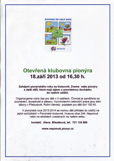 Naše dětská organizace Pionýr připravuje a organizuje volný čas dětem a dospělákům v malém městečku jižně od Plzně.