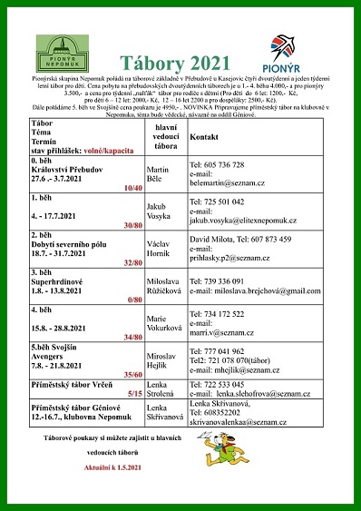 Pionýrská skupina Nepomuk připravila pro léto 2025 šest táborových běhů, tábor rodičů s dětmi a tři příměstské tábory.. O přihlášky na tábory si můžete napsat nebo zavolat na kontakty uvedené v letáčku. img