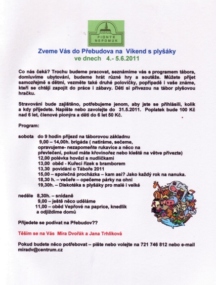 Naše dětská organizace Pionýr připravuje a organizuje volný čas dětem a dospělákům v malém městečku jižně od Plzně.